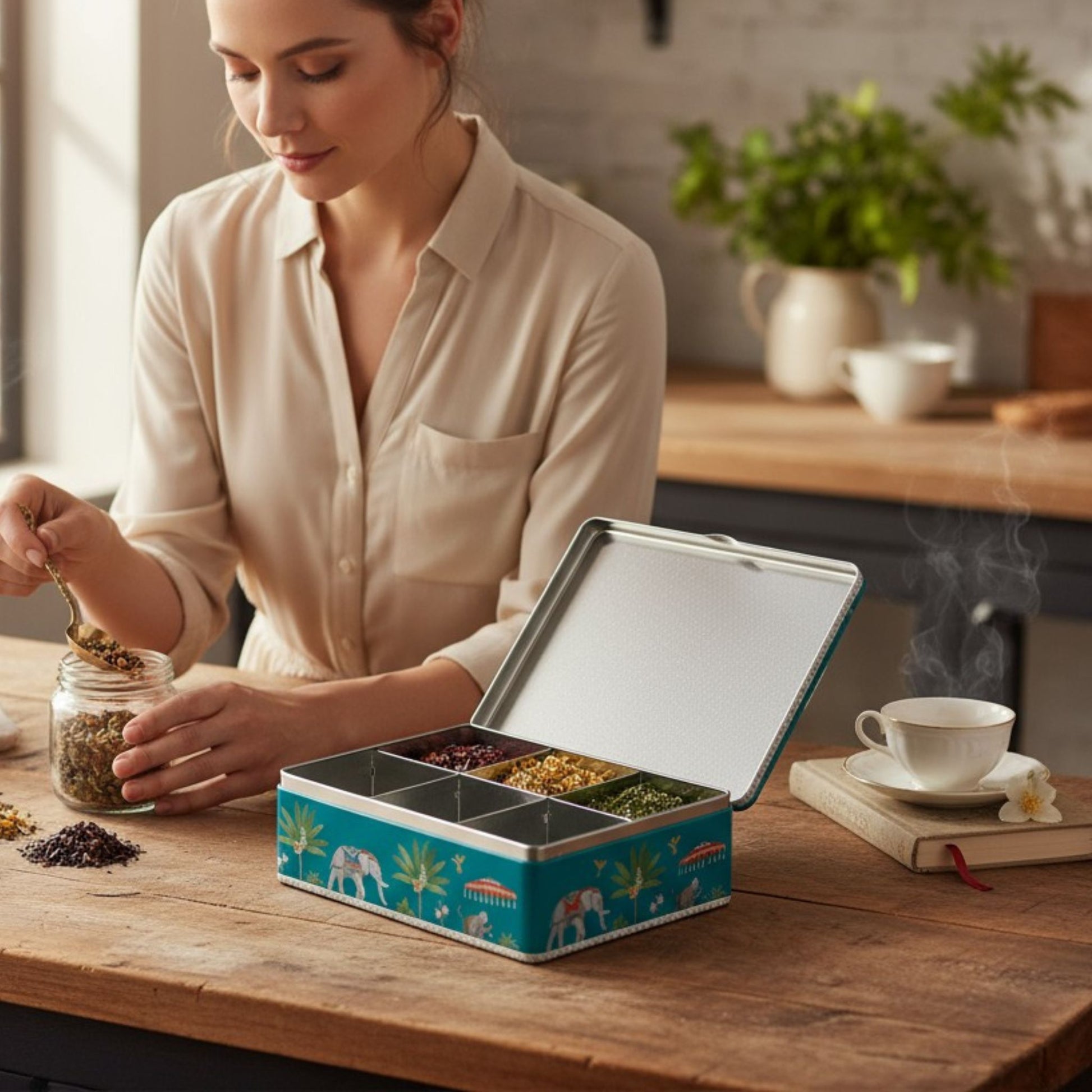 La Caja de Té Jungle Vibes en color calipso es una pieza vibrante que combina funcionalidad y diseño exuberante. Decorada con elefantes, monos, flores tropicales y palmeras, evoca una atmósfera selvática y festiva. Cuenta con compartimentos internos para que puedas organizar hasta 6 variedades distintas de bolsitas de té. Ideal para quienes aman el té… y el diseño con alma.