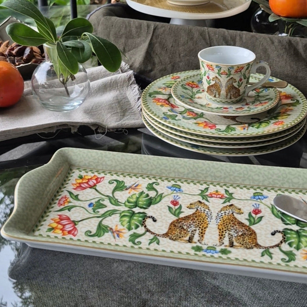 La Fuente Jungle Vibes de porcelana italiana mide 15 x 35 cm y está decorada con dos leopardos en simetría, rodeados de una selva exuberante y flores vibrantes. Su borde verde oliva y los detalles dorados aportan un aire de sofisticación a este diseño lleno de color y carácter. Ideal para servir entradas, quesos, postres o usar como pieza decorativa.