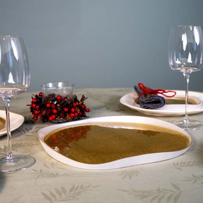 El plato Balat Pearl Gold es una pieza de vidrio esmaltado de 32 cm de largo, con un diseño orgánico y contemporáneo. Su base perla y centro dorado texturizado crean un contraste suave pero llamativo, ideal para presentar quesos, panes, frutas o como bandeja decorativa.
