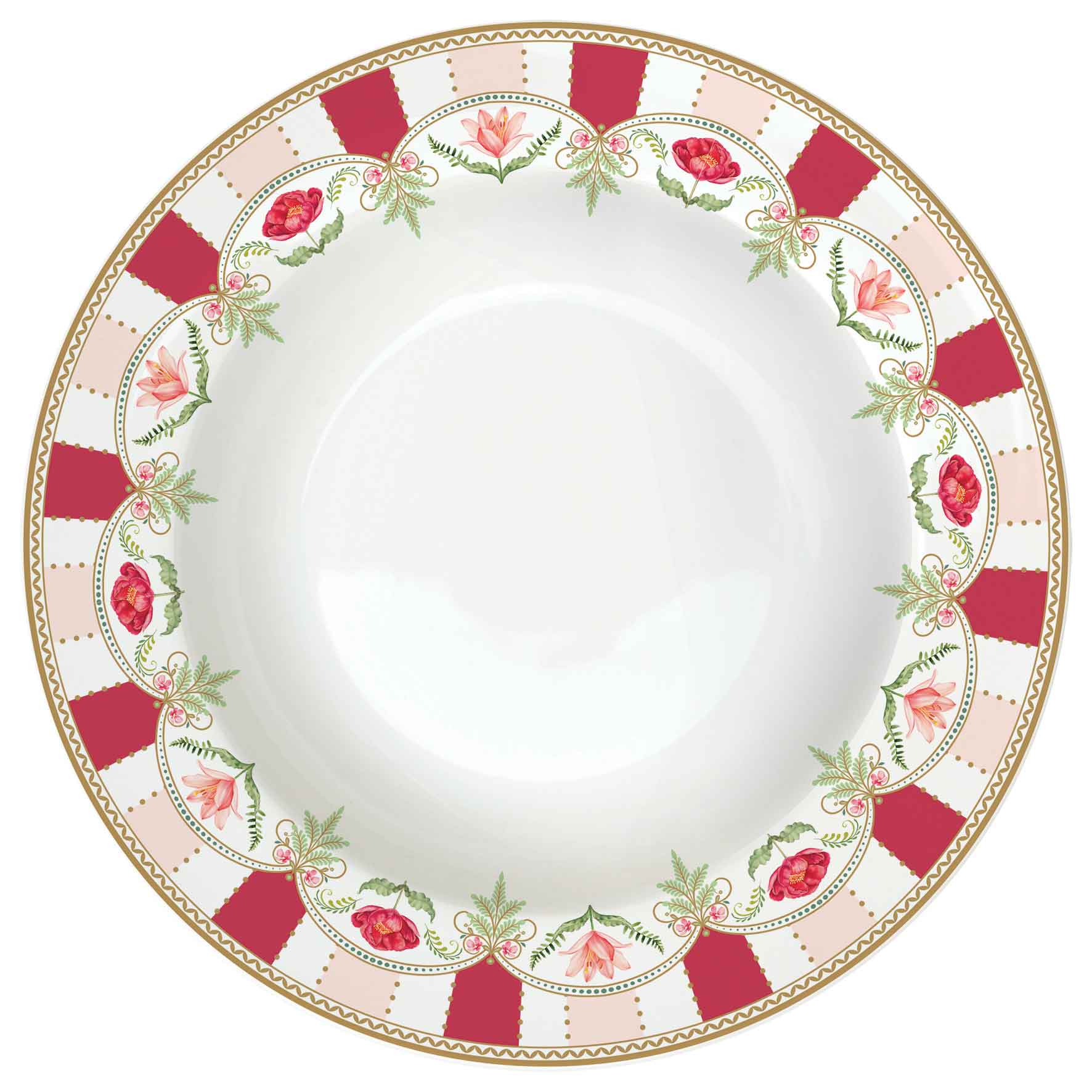 El Plato Hondo Flowery Ø 21,5 cm luce un borde floral con toques granate y dorado que aporta calidez sin recargar. Fabricado en porcelana italiana, es perfecto para sopas, cremas otoñales o pastas con salsa.