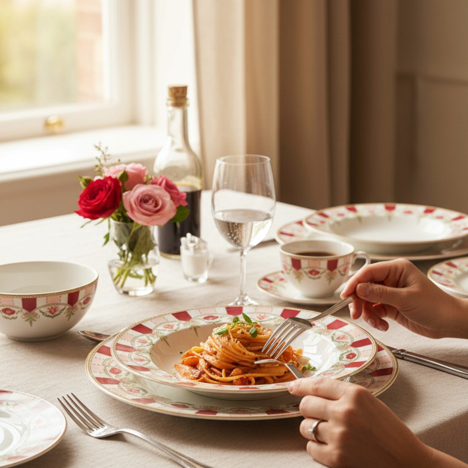 Flores delicadas, paleta rosada y detalles dorados que visten tu mesa con elegancia italiana.