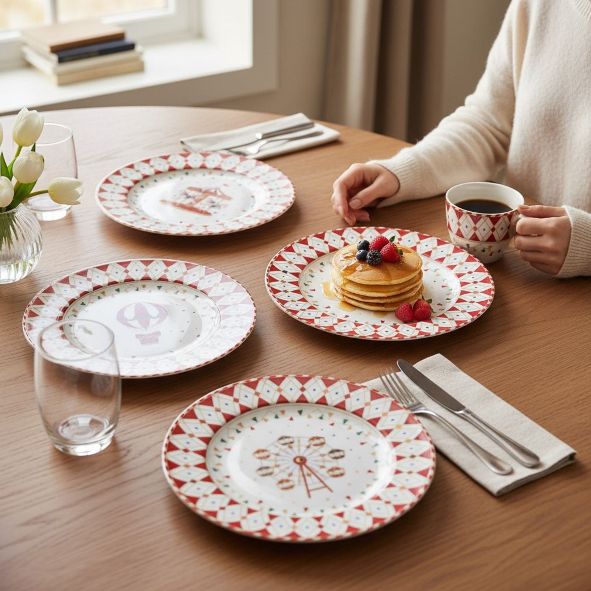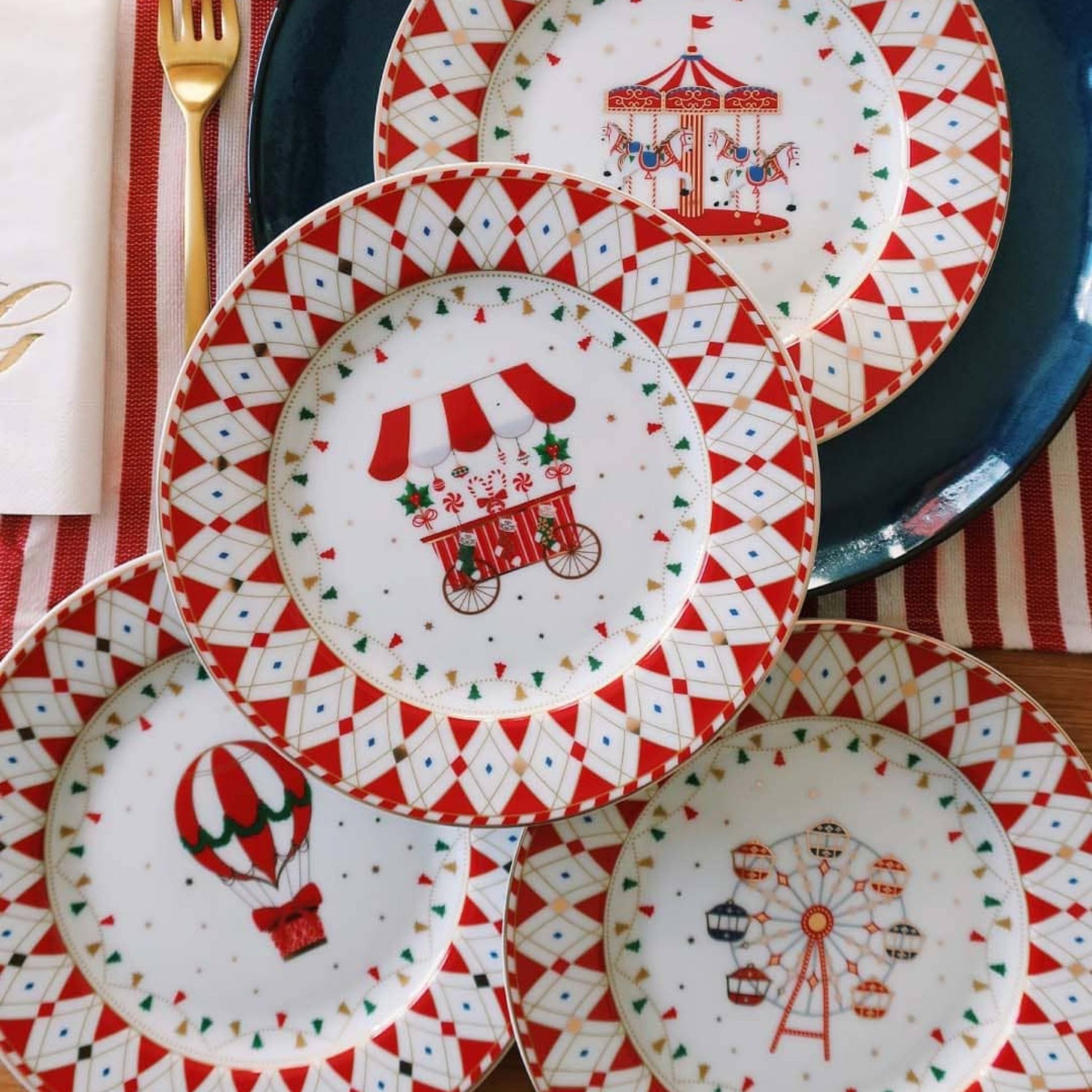 El set Christmas Wonderland incluye 4 platos de postre de 19 cm, cada uno con un diseño distinto —carrusel, noria, globo aerostático y carrito— sobre fondo blanco con patrón de rombos. Inspirados en la magia de las ferias navideñas, estos platos de porcelana italiana convierten cualquier sobremesa en un momento memorable.