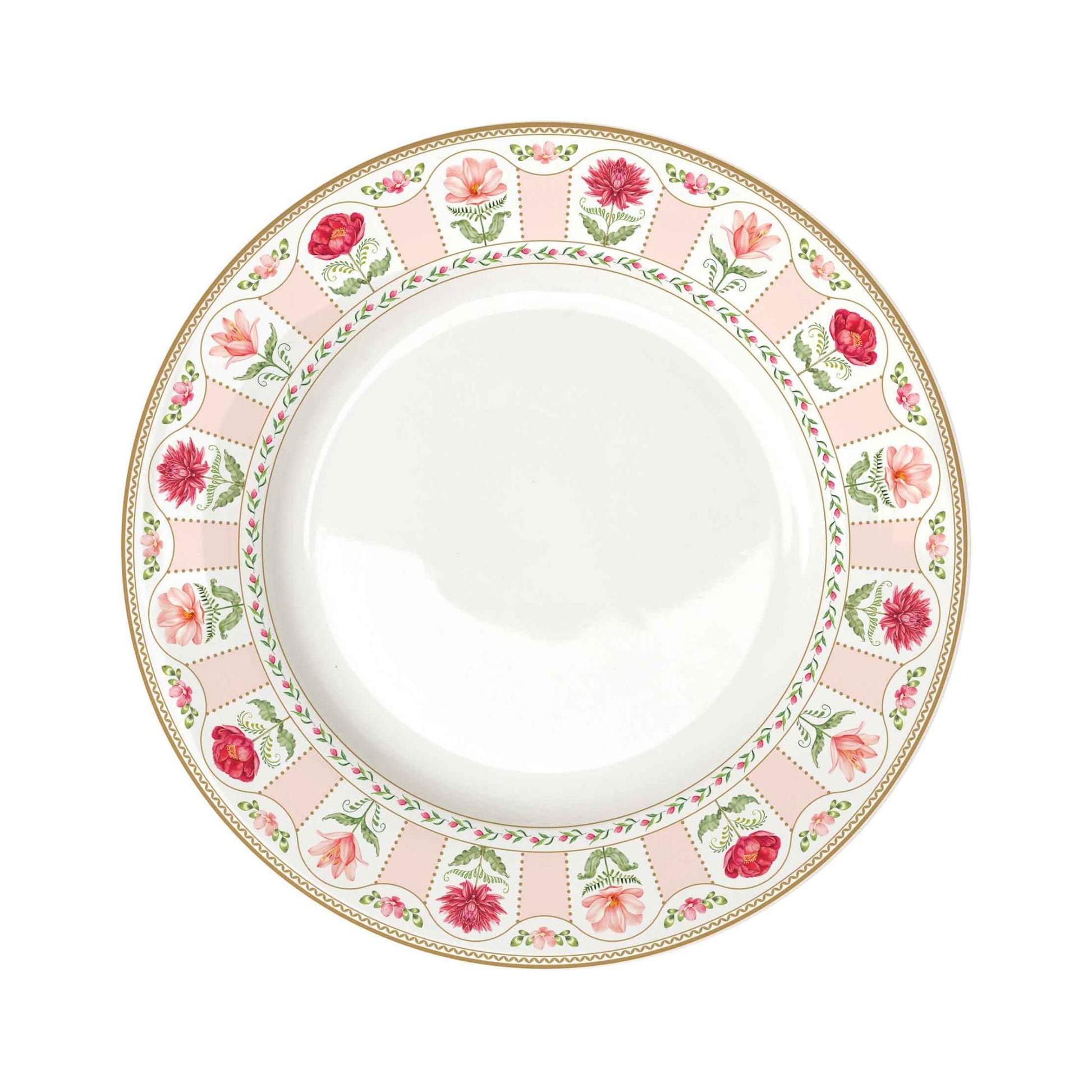 El Plato Principal Flowery luce un borde floral en paleta rosada con acentos granate y dorado. Hecho en porcelana italiana, aporta calidez y un toque romántico a la mesa diaria o a ocasiones especiales. Queda perfecto combinado con el plato hondo y de postre de la misma colección.