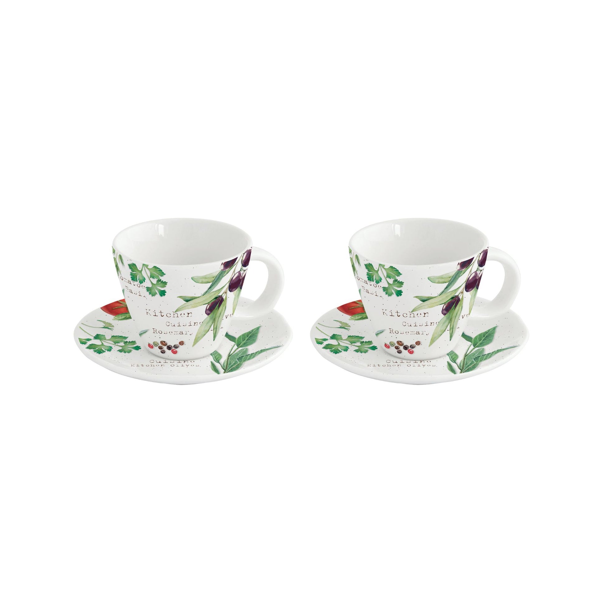 El Set Home & Kitchen incluye 2 tazas de porcelana italiana con sus platillos (120 ml), presentadas en caja ilustrada. El diseño botánico —albahaca, perejil, aceitunas y especias— aporta un aire mediterráneo perfecto para disfrutar el primer sorbo del día o una pausa de la tarde.
